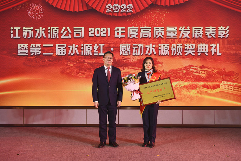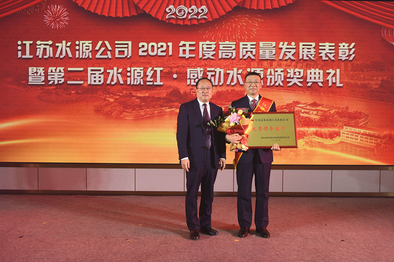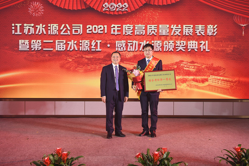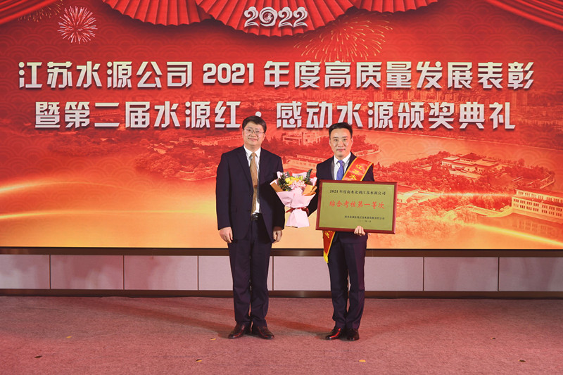 公司黨委副書(shū)記、總經(jīng)理袁連沖宣讀《南水北調(diào)江蘇水源公司關(guān)于2021年度綜合考核結(jié)果的通知》和《南水北調(diào)江蘇水源公司黨委關(guān)于表彰2021年度“水源紅·感動(dòng)水源”先進(jìn)集體和先進(jìn)個(gè)人的決定》 。